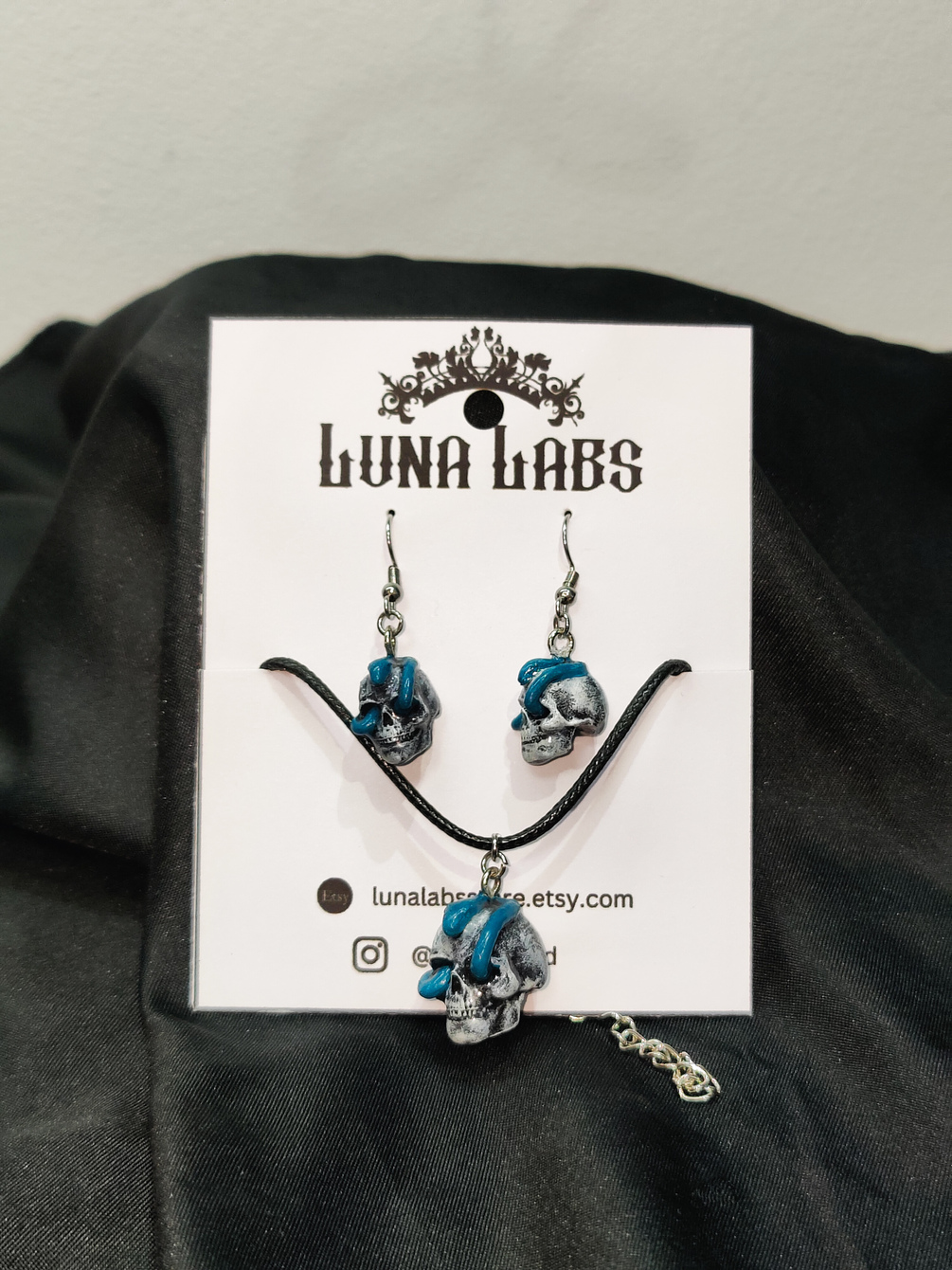 The necklace and earrings set was sculpted by hand in Nomad Sculpt, and printing using ABS-like resin with a 3D printer. Lastly, they were hand painted and coated in epoxy resin for a durable finish.