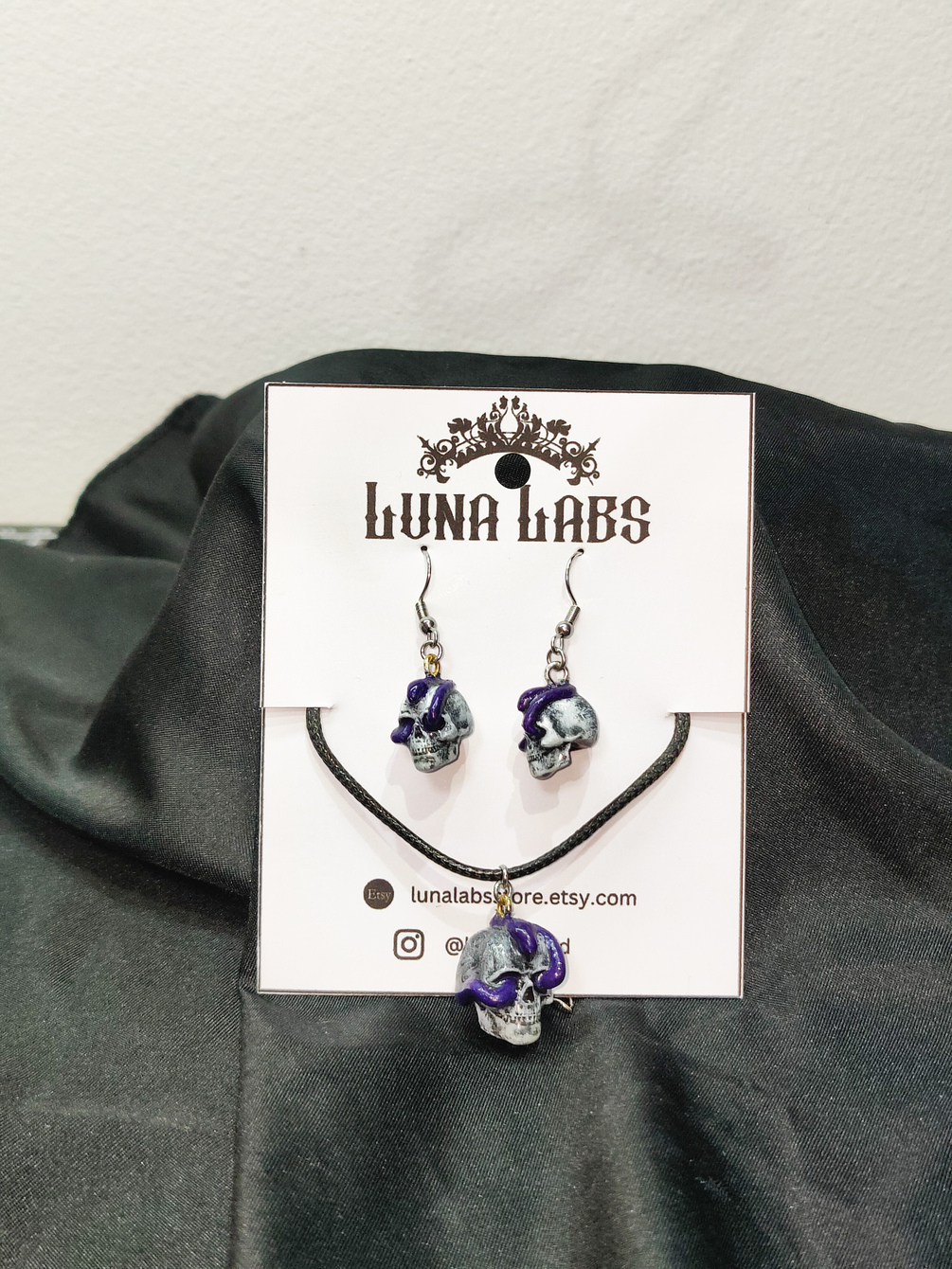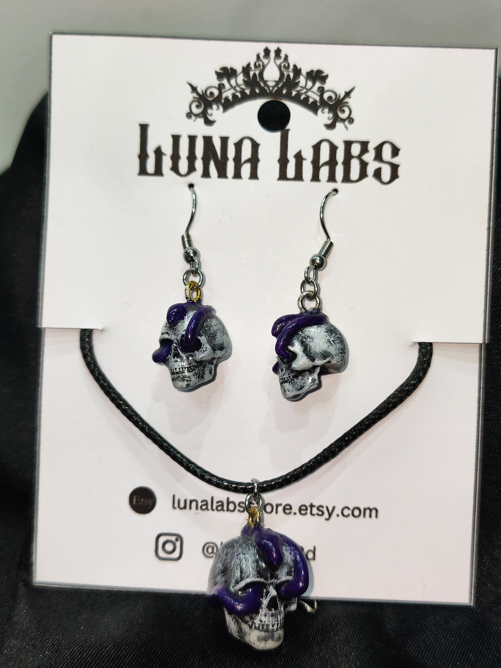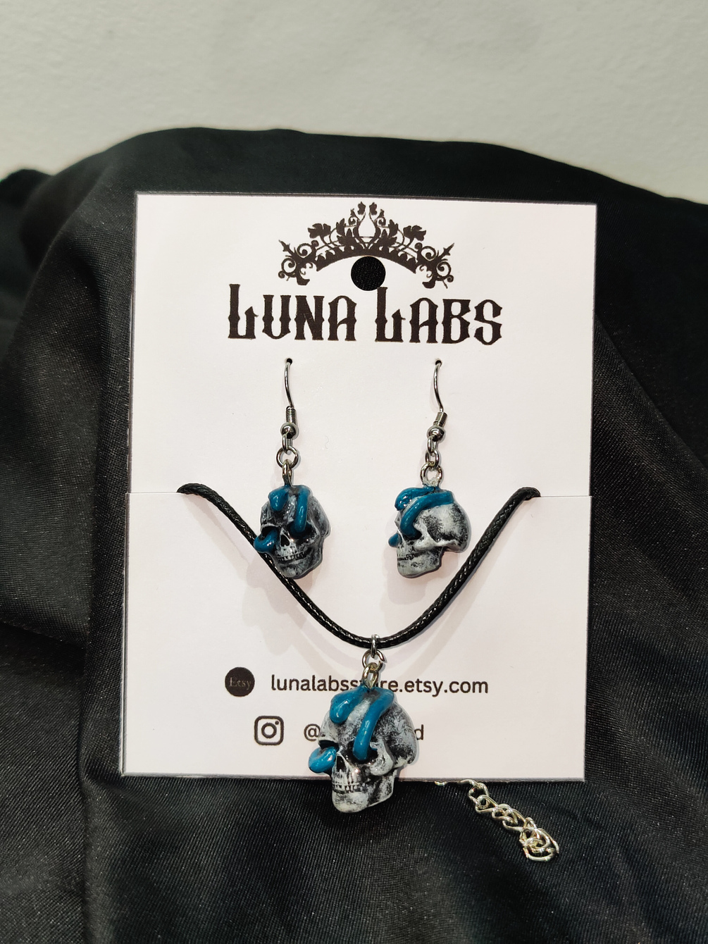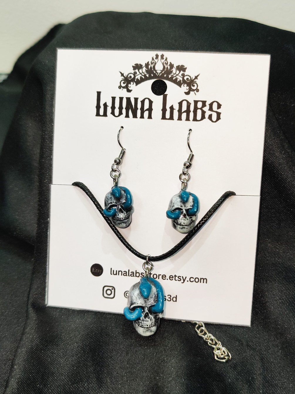 The necklace and earrings set was sculpted by hand in Nomad Sculpt, and printing using ABS-like resin with a 3D printer. Lastly, they were hand painted and coated in epoxy resin for a durable finish.